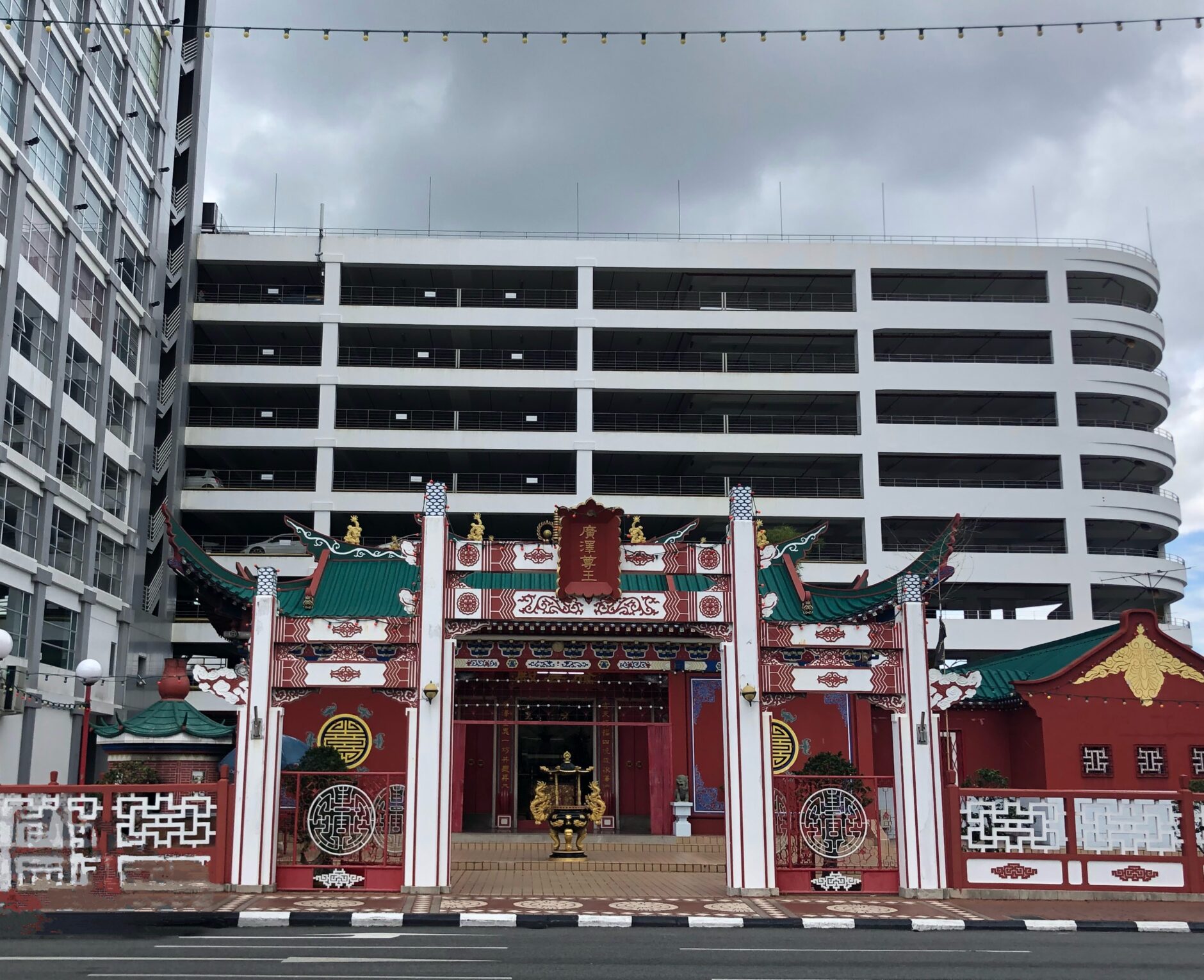 The first temple was built in 1918 but was destroyed in order to expand the port. As a result, Teng Yun Temple was built in 1960 and is now the oldest Chinese temple in Brunei. The small, red and white temple with its bright green roof sits in stark contrast against the backdrop of a drab multi-level parking lot.