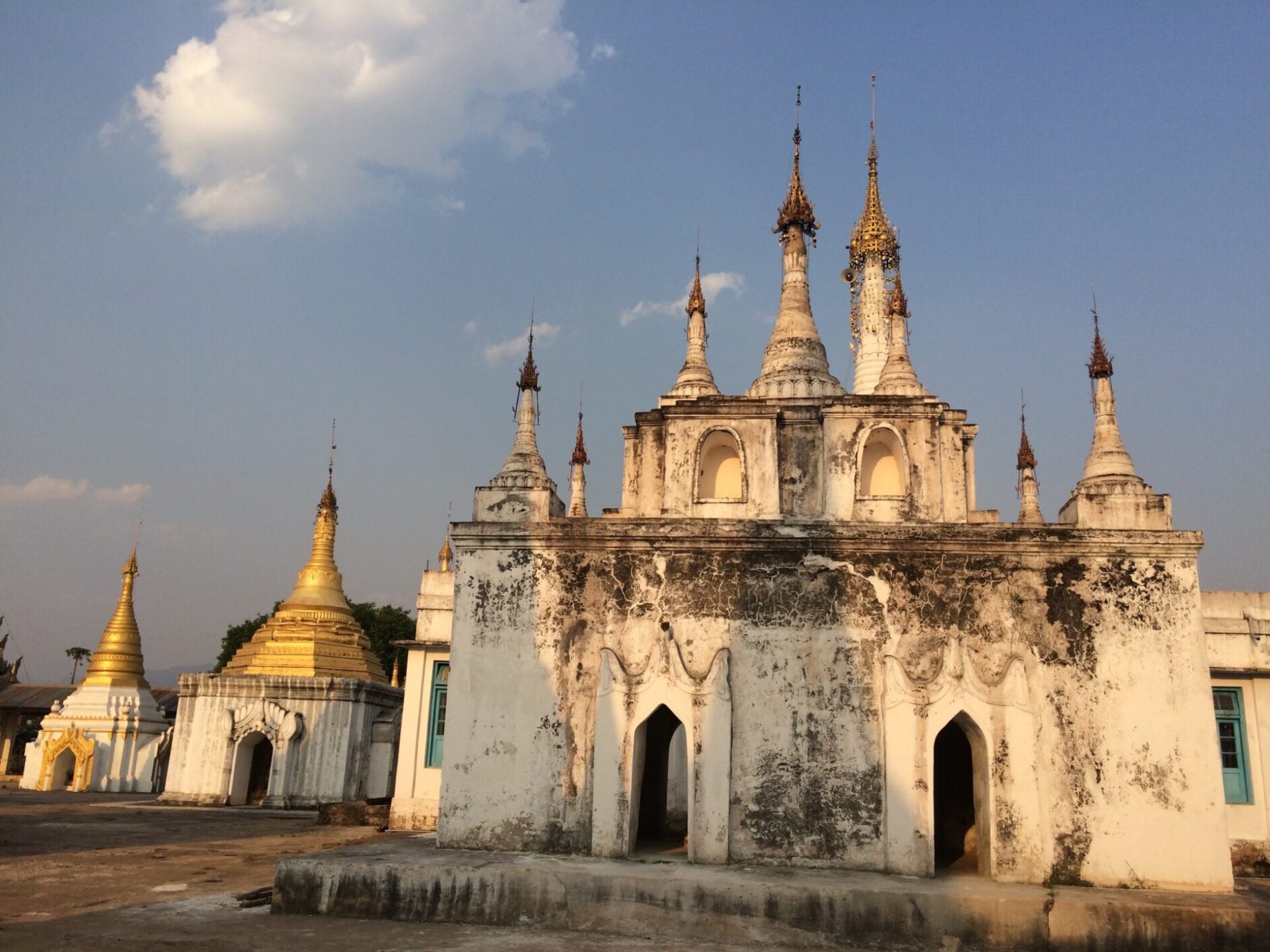 Several stupas across the river caught my eye. Next up, I visited Aung Mingalar. I peeked into the hollowed out shrines, catching sight of several beautiful Buddha images. All the Buddha images were draped in gold leaves. Each one had a different facial expression. I loved how there were zero tourists here. I indulged in the peacefulness.